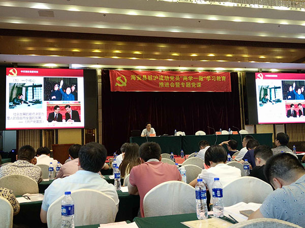 同時,根據(jù)縣委組織部對“兩學(xué)一做”教育活動的工作安排,“聯(lián)合黨委”于5月19日下午舉行“兩學(xué)一做”教育活動專題黨課?!奥?lián)合黨委”書記李忠澤作“兩學(xué)一做”動員報告,海安縣委黨校常務(wù)副校長徐進(jìn)、副校長程衛(wèi)國分別作“學(xué)習(xí)黨章、學(xué)習(xí)系列講話”專題黨課,海安籍在滬流動黨員近400人參加活動。