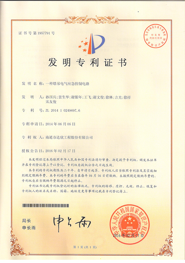 【另 訊】:由第五工程公司2014年6月申報的《一種塔吊電氣應(yīng)急控制電路》,于2016年2月17日獲得國家知識產(chǎn)權(quán)局授權(quán)的發(fā)明專利證書。