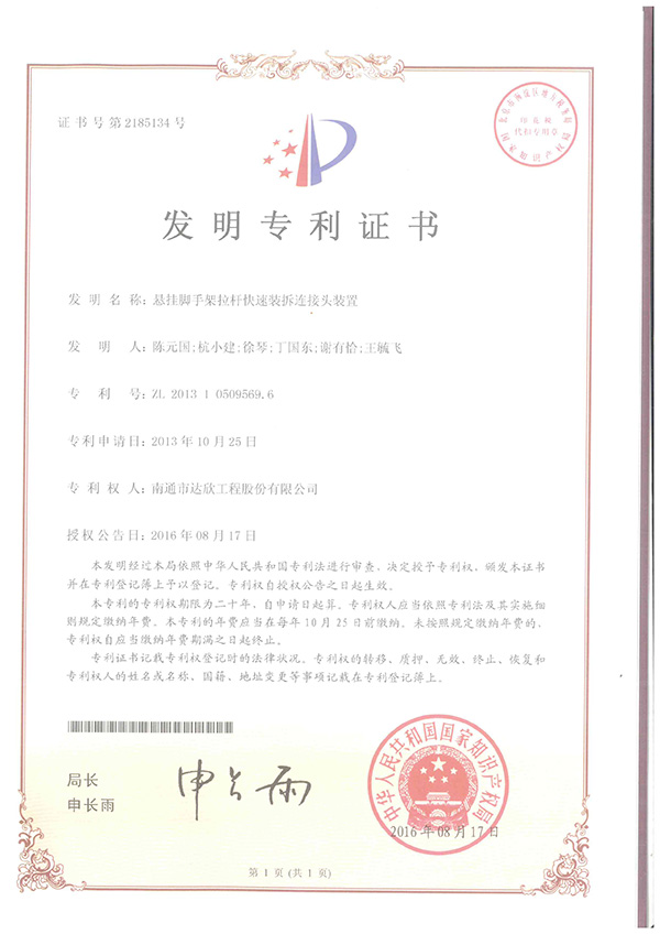 由第一工程公司申報的《懸掛腳手架拉桿快速裝拆連接頭裝置》成功獲國家知識產(chǎn)權(quán)局授權(quán),于2016年8月17日獲得國家發(fā)明專利證書。該發(fā)明專利系工程公司《無攬風繩獨立桅桿吊裝勁性鋼柱專用夾具》后又一國家發(fā)明專利。