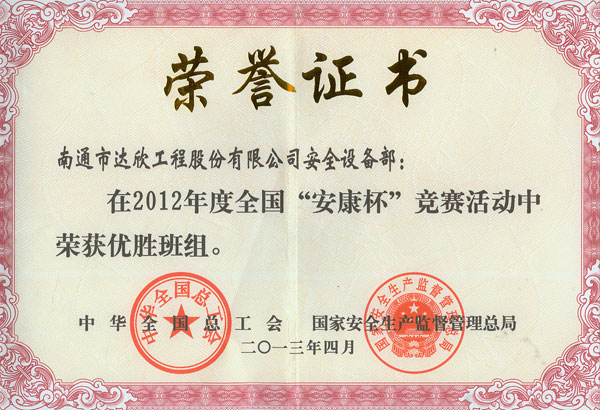 一直以來(lái)公司深入開展“安康杯”競(jìng)賽活動(dòng),努力提高企業(yè)安全生產(chǎn)管理水平,提升安全發(fā)展的能力,營(yíng)造了達(dá)欣安全平安的良好環(huán)境,維護(hù)了廣大職工生命安全和身體健康,經(jīng)過(guò)上級(jí)主管部門的檢查、評(píng)比、推薦,公司安全設(shè)備部獲得了2012年度全國(guó)“安康杯”競(jìng)賽“優(yōu)勝班組”稱號(hào)。