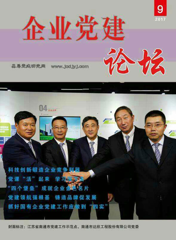 9月的《企業(yè)黨建》雜志,以封面人物的形式,刊登了由海安縣委組織部副部長周小軍、組織科科長吳蘭,撰寫推薦的江蘇省南通市黨建工作示范點(diǎn)——南通市達(dá)欣工程股份有限公司黨委的黨建成果。
