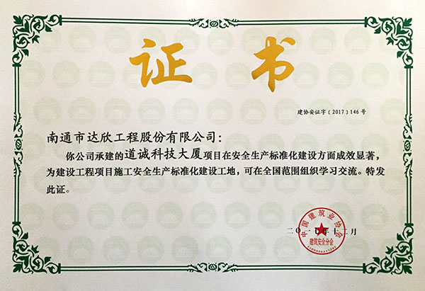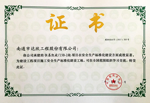 近幾年,我公司獲得全國AAA級安全文明標準化工地25項,創(chuàng)建面涉及上海、江蘇、河北、黑龍江、湖南、新疆等市場,榮譽的取得為進一步提升“達欣”在全國各個市場的影響力,促進企業(yè)健康發(fā)展奠定堅實的品牌基礎。