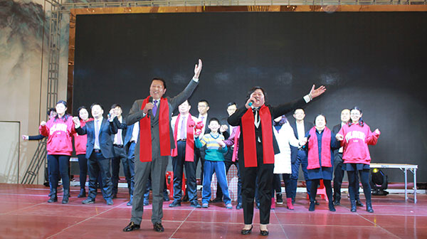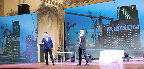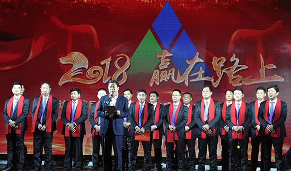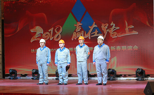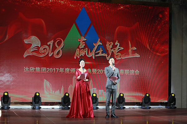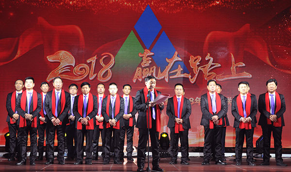 集團(tuán)高管們?cè)谂炫鹊摹拔覀冏咴诖舐飞稀甭曋屑で榈菆?chǎng),公司董事長(zhǎng)馬和軍進(jìn)行了致辭答謝。他回顧了集團(tuán)一年來(lái)所取得的輝煌成績(jī),感謝社會(huì)各界及全體達(dá)欣人的努力,并對(duì)公司的未來(lái)之路描繪了新的發(fā)展藍(lán)圖;接著,縣委書(shū)記顧國(guó)標(biāo)發(fā)表講話, 他指出,作為全縣經(jīng)濟(jì)社會(huì)發(fā)展的重要板塊,我縣建筑業(yè)總體發(fā)展態(tài)勢(shì)良好,總量和質(zhì)量穩(wěn)步提升。作為“海安建筑鐵軍”中的一支老牌“勁旅”,達(dá)欣集團(tuán)的市場(chǎng)競(jìng)爭(zhēng)力和品牌影響力不斷提升,他對(duì)公司2018年工作提出了新的希望,寄語(yǔ)未來(lái)集團(tuán)要進(jìn)一步深化企業(yè)體制機(jī)制創(chuàng)新,全面加快產(chǎn)業(yè)升級(jí)步伐,全面實(shí)施“科技強(qiáng)企”戰(zhàn)略,搶抓機(jī)遇,精準(zhǔn)定位,打造達(dá)欣更加輝煌的未來(lái)!