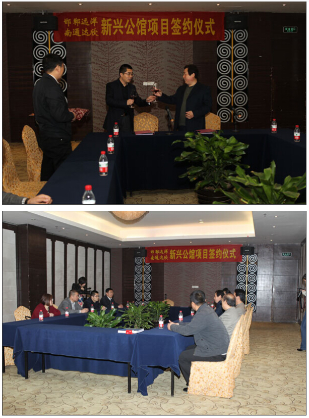 4月10日,遠洋集團地產(chǎn)公司總經(jīng)理段海山、達欣股份副總經(jīng)理楊靜在邯鄲市星際美高大酒店進行項目合作簽約儀式。地產(chǎn)公司工程副總李秀山、總工程師李秀峰、工程公司邯鄲總指揮陳仁富等一同參加簽約儀式。