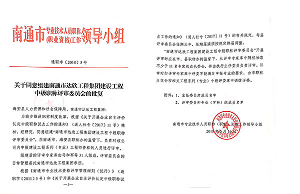日前,根據(jù)《關(guān)于開(kāi)展企業(yè)自主評(píng)價(jià)認(rèn)定中級(jí)職稱試點(diǎn)工作的通知》(通人社專〔2017〕11號(hào))精神,南通市專業(yè)技術(shù)人員職稱(職業(yè))資格工作領(lǐng)導(dǎo)小組專題文件批復(fù),同意組建“南通市達(dá)欣工程集團(tuán)建設(shè)工程中級(jí)專業(yè)技術(shù)資格評(píng)審委員會(huì)”,達(dá)欣集團(tuán)由此獲得“中級(jí)職稱自主評(píng)價(jià)認(rèn)定資格”。