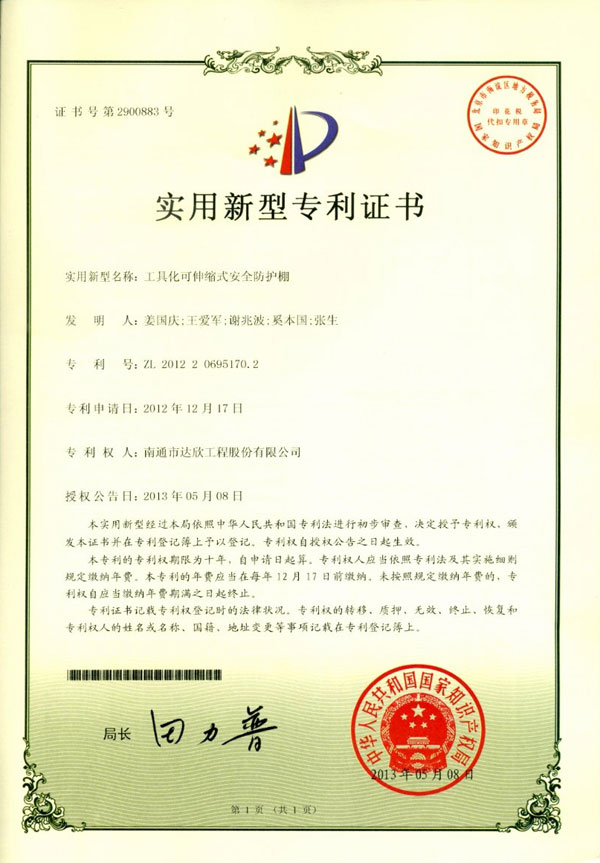 第六工程公司申報(bào)的《組裝式臨邊洞口防護(hù)欄》、《工具化可伸縮式安全防護(hù)棚》專(zhuān)利成果,日前,獲得國(guó)家實(shí)用新型專(zhuān)利證書(shū)。