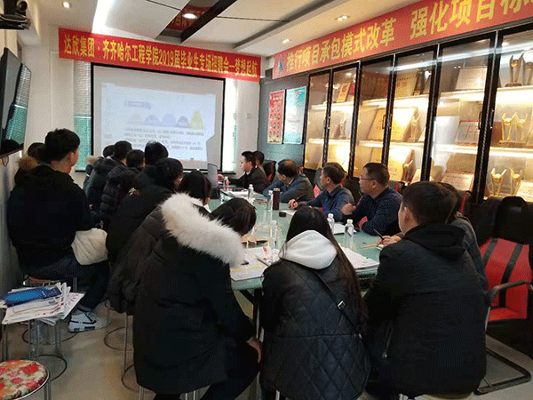 畢業(yè)生們首先觀看了集團公司和工程公司宣傳片,工程公司經(jīng)理陳貴榮就公司的發(fā)展概況、企業(yè)文化、本次招聘的工作崗位以及薪酬、福利等內(nèi)容作了介紹。隨后,畢業(yè)生們進行了自我簡介,現(xiàn)場咨詢了有關(guān)工作的情況,陳經(jīng)理一一進行了詳細解答,幫助他們更好的了解達欣集團。聽取了介紹后,畢業(yè)生們也紛紛表達了想加入到達欣團隊中的意愿。