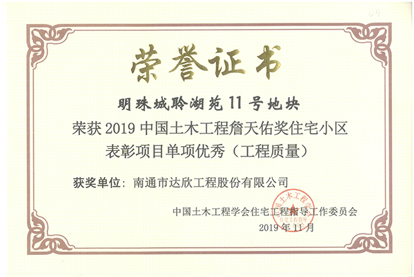 達(dá)欣集團(tuán)承建的新湖明珠城聆湖苑11號地塊榮獲2019中國土木工程詹天佑獎(jiǎng)住宅小區(qū)表彰項(xiàng)目