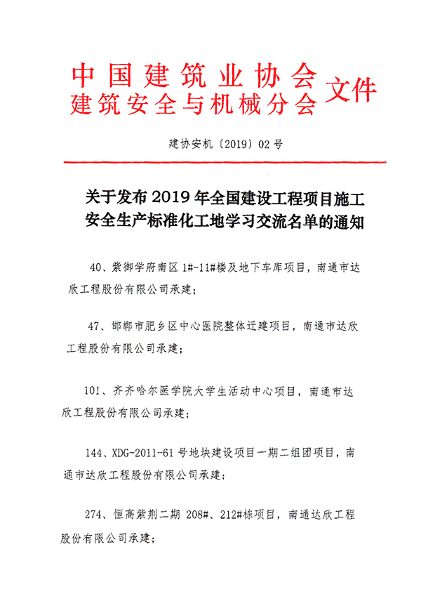 近日,從中國建筑業(yè)協(xié)會建筑安全分會傳來喜訊,達(dá)欣集團(tuán)五項工程同時獲得國家建筑安全文明施工領(lǐng)域最高獎項“全國建設(shè)工程項目施工安全生產(chǎn)標(biāo)準(zhǔn)化工地”,再次刷新了公司安全創(chuàng)優(yōu)新記錄。