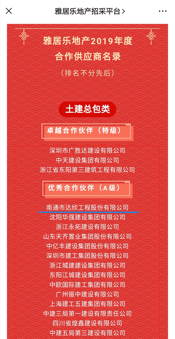 見證達欣以品質說話 榮獲雅居樂地產優(yōu)秀總承包A級合作伙伴