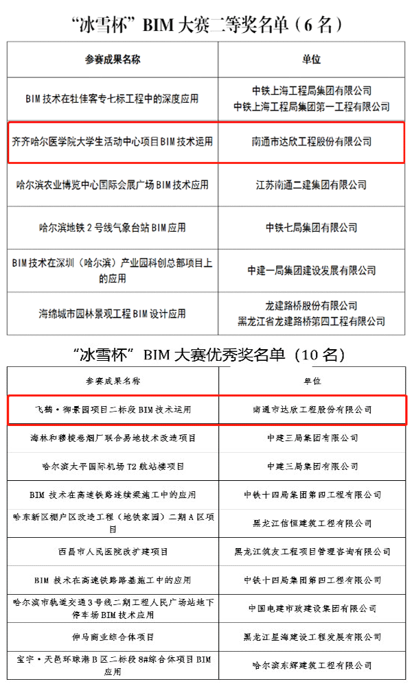 近日,由黑龍江建筑協(xié)會(huì)主辦的第一屆“冰雪杯”建設(shè)工程BIM大賽決賽評(píng)比結(jié)果公示,第七工程公司兩項(xiàng)目分獲二等獎(jiǎng)和優(yōu)秀獎(jiǎng)。