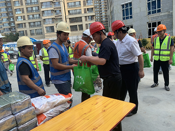 市長于立忠一行為大家送來了毛巾、防暑降溫飲品等消暑物品,感謝大家為建造和諧社會、美好家園在高溫酷暑中依然堅(jiān)守,為祖國、為家鄉(xiāng)做貢獻(xiàn),同時(shí)也希望大家立足本職工作,繼續(xù)發(fā)揚(yáng)特別能吃苦、特別能戰(zhàn)斗的主力軍作風(fēng),展現(xiàn)新時(shí)期達(dá)欣鐵軍隊(duì)伍特有的風(fēng)采,并反復(fù)叮囑大家一定要安全施工,合理安排作息時(shí)間,勞逸結(jié)合,保重身體,做好防暑降溫措施。