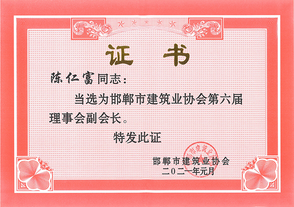2021年1月8日,邯鄲市建筑業(yè)協(xié)會(huì)第六屆會(huì)員大會(huì)第二次會(huì)議在邯鄲舉行。會(huì)上,第三工程公司總經(jīng)理陳仁富當(dāng)選為邯鄲市建筑業(yè)協(xié)會(huì)第六屆理事會(huì)副會(huì)長(zhǎng)。