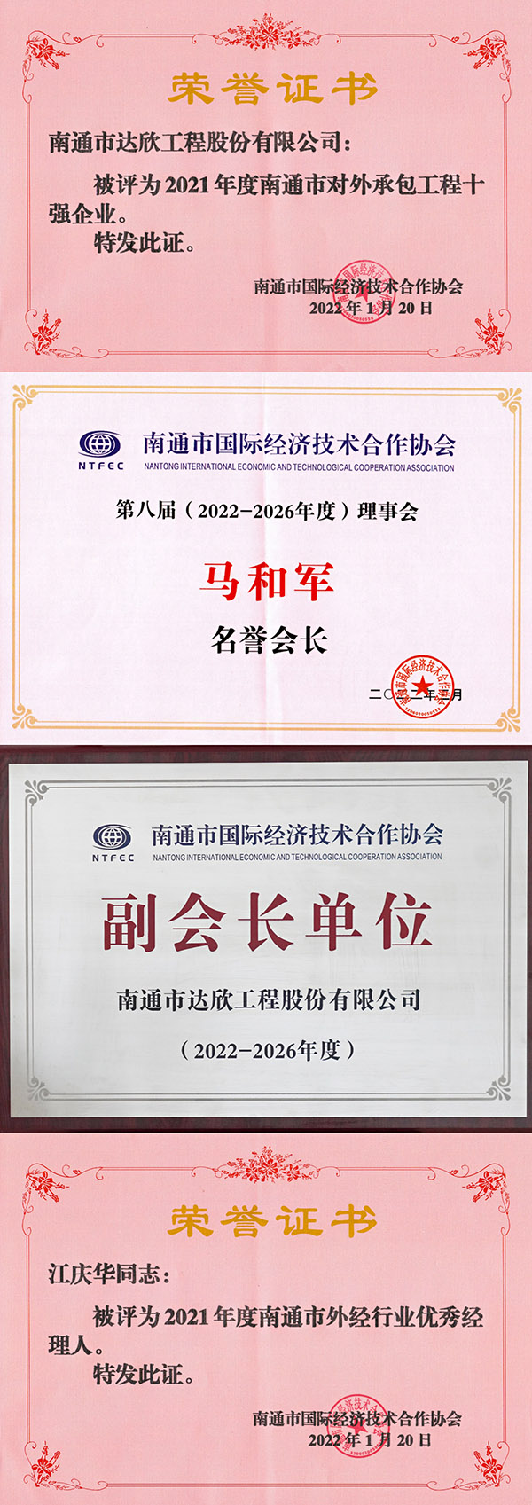 會上,達(dá)欣集團(tuán)被評為2021年度南通市對外承包工程十強(qiáng)企業(yè),董事長馬和軍當(dāng)選第八屆(2022-2026年度)理事會名譽(yù)會長,企業(yè)當(dāng)選為副會長單位,柬埔寨分公司江慶華被評為南通市外經(jīng)行業(yè)優(yōu)秀經(jīng)理人。