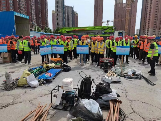 第三工程公司接到通知后,以副經(jīng)理吉祥為組長的應急救援小組及時出動,攜帶水泵、發(fā)電機、鐵鍬、頭燈、沙袋、雨靴等防汛物資,參加演練。