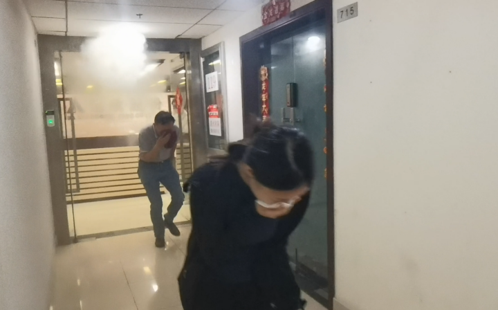 現(xiàn)場從發(fā)現(xiàn)著火點(diǎn)、報警、疏散人員等情景開展模擬演練。隨著火警警報的響起,在場人員立即按照預(yù)先制定的疏散方案行動。大家迅速采取“彎腰低頭、捂鼻貼墻”的逃生姿勢,在疏散過程中,大家保持冷靜,有序地沿著疏散通道向室外撤離。