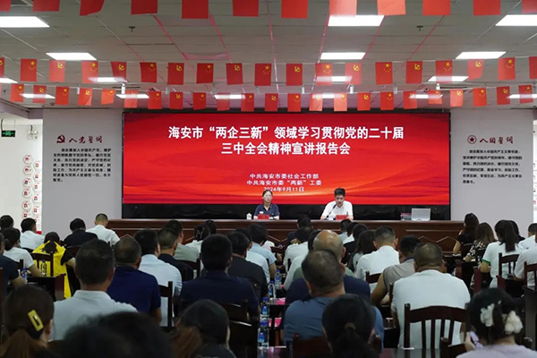 為全面深入學(xué)習(xí)宣傳貫徹黨的二十屆三中全會精神,激發(fā)黨員干事創(chuàng)業(yè)的熱情,9月11日,集團(tuán)黨委以海安市召開的“兩企三新”領(lǐng)域?qū)W習(xí)貫徹黨的二十屆三中全會精神宣講報告會為契機組織黨員集中學(xué)習(xí),集團(tuán)副董事長、總經(jīng)理王邦國,黨委副書記、副董事長、紀(jì)委書記楊靜以及集團(tuán)在海黨員參與線下現(xiàn)場教學(xué),各駐外黨支部黨員以視頻會議的形式進(jìn)行遠(yuǎn)程參學(xué)。