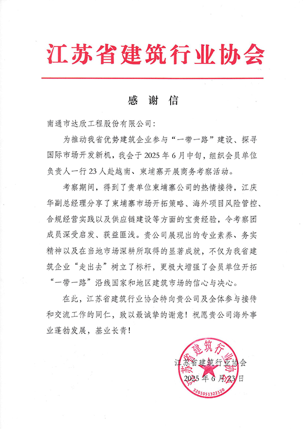 6月23日,集團收到來自江蘇省建筑行業(yè)協(xié)會的感謝信。信中對集團柬埔寨公司在省協(xié)會組織會員單位赴柬埔寨商務(wù)考察期間,以專業(yè)實力與豐富的實踐為考察團提供有益的幫助,特此專函致謝。