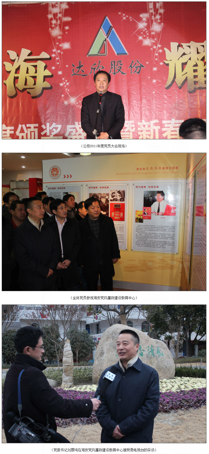 會(huì)議由公司董事長、黨委副書記馬和軍同志主持,上午在進(jìn)行了4名預(yù)備黨員同志入黨誓詞、各支部推薦的7名優(yōu)秀黨員后,盧榮翔書記對公司全體黨員進(jìn)行了冬訓(xùn)補(bǔ)課講座,他從家鄉(xiāng)的建設(shè)發(fā)展、建筑業(yè)面臨的發(fā)展機(jī)遇等進(jìn)行了講述,并對公司的未來發(fā)展方向提出了要求與希望,勉勵(lì)全體黨員要在科學(xué)觀的引領(lǐng)下,積極開展創(chuàng)先爭優(yōu)活動(dòng),為達(dá)欣的強(qiáng)勁發(fā)展做出應(yīng)有的貢獻(xiàn)。接著公司黨委書記劉厚純同志作了題為“揚(yáng)帆起航聚心力,創(chuàng)先爭優(yōu)求發(fā)展”2010年黨建總結(jié)暨2011年黨建工作要求的報(bào)告,報(bào)告從突出黨組織建設(shè),發(fā)揮堅(jiān)強(qiáng)的堡壘作用、突出生產(chǎn)經(jīng)營建設(shè),為企業(yè)發(fā)展助力升威、突出改革創(chuàng)新理念,發(fā)揮黨員引領(lǐng)作用、突出“創(chuàng)先爭優(yōu)”活動(dòng)主題,營造積極向上的企業(yè)氛圍等六個(gè)方面對2010年進(jìn)行了總結(jié),對2011年的黨建工作目標(biāo)、工作重點(diǎn)、工作舉措進(jìn)行了闡述,要求全體黨員同志要進(jìn)一步增強(qiáng)政治意識(shí)、責(zé)任意識(shí)、創(chuàng)新創(chuàng)優(yōu)意識(shí)、大局意識(shí),為公司全面完成2011年各項(xiàng)工作任務(wù)而共同努力!