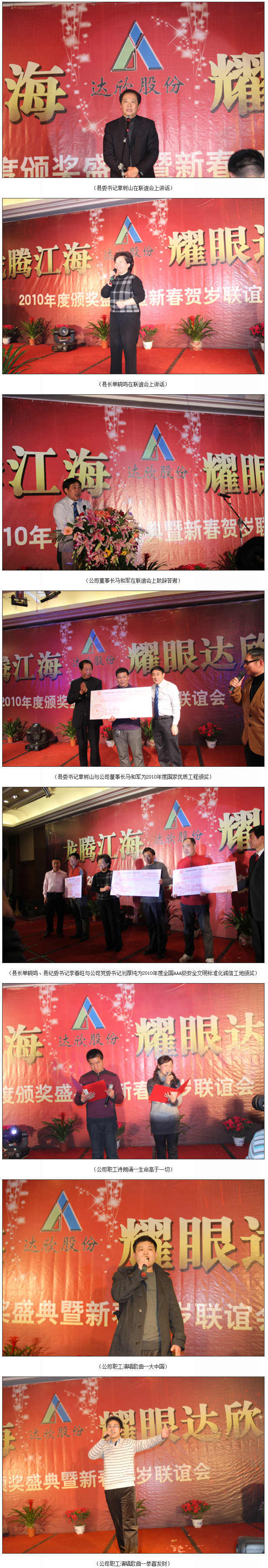 在喜慶樂典和主持人高亢激昂的道白后,首先回睦了2010年公司精彩的展示專題片,公司董事長馬和軍隨后進(jìn)行了致辭答謝。他回顧了公司一年來所取得的輝煌成績,感謝社會各界及公司全體同仁們的努力,并對公司的未來發(fā)展之路描繪了藍(lán)圖;接著,縣委書記章樹山發(fā)表重要講話,他指出,建筑業(yè)是我縣的傳統(tǒng)產(chǎn)業(yè),也是一個富民強(qiáng)勢產(chǎn)業(yè),還是我縣財政收入的重要來源之一,作為縣內(nèi)的骨干企業(yè),達(dá)欣公司步入了公司歷史以來發(fā)展最快、榮譽最高、分配最多、貢獻(xiàn)最大的時期,他希望公司要加快發(fā)展,高起點定位,突出重點,好中求快,實現(xiàn)達(dá)欣新飛躍。