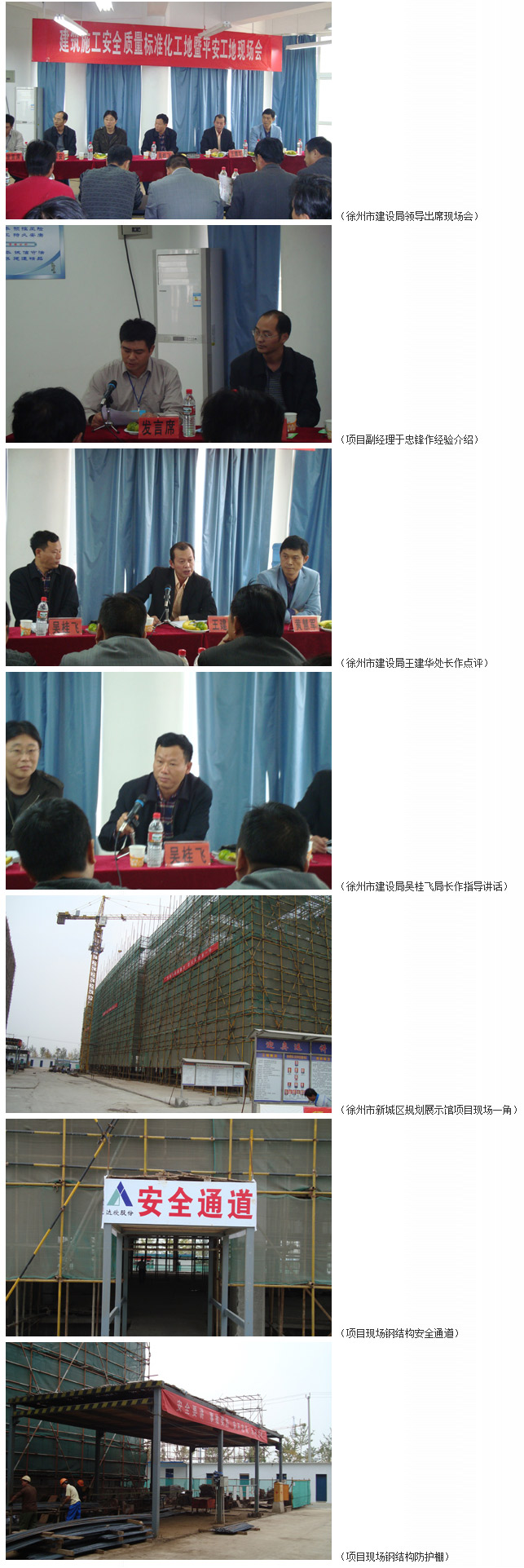 徐州市建設(shè)局安監(jiān)處王建華處長(zhǎng)在講話中對(duì)本工程“創(chuàng)質(zhì)量安全標(biāo)準(zhǔn)化、平安工地”給予了高度評(píng)價(jià),并總結(jié)了“八大亮點(diǎn)”:1、現(xiàn)場(chǎng)道路及場(chǎng)地硬化到位;2、農(nóng)民工學(xué)校的內(nèi)容具體、真實(shí);3、現(xiàn)場(chǎng)的警示標(biāo)志形象、生動(dòng),有特點(diǎn);4、腳手架搭設(shè)規(guī)范;5、現(xiàn)場(chǎng)排水溝及集水井嚴(yán)格按照J(rèn)GJ59—99的要求設(shè)計(jì)、施工;6、定型化產(chǎn)品(組裝式鋼結(jié)構(gòu)防護(hù)棚)的投入使用;7、現(xiàn)場(chǎng)的臨邊防護(hù)規(guī)范;8、設(shè)置曝光欄有特點(diǎn),做到處罰有根據(jù)。