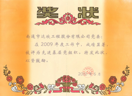 2010年公司成立黨委,在新一屆黨委的領(lǐng)導(dǎo)下,公司全體黨員積極開展創(chuàng)先爭優(yōu)活動,以“腳手架上黨旗揚”為主題,將支部建在項目上,做到“關(guān)鍵崗位有黨員、困難面前有黨員、突擊攻關(guān)有黨員,黨員帶頭技改創(chuàng)新、帶頭攻堅克難、帶頭建功立業(yè)”,充分發(fā)揮黨、團、工會組織在施工生產(chǎn)和經(jīng)濟建設(shè)中的先鋒堡壘作用,促進企業(yè)和諧發(fā)展。公司劉厚純、馬和軍、徐仁忠、徐桂壽等4人被海安工業(yè)園區(qū)黨委、胡集鎮(zhèn)黨委評為優(yōu)秀共產(chǎn)黨員。