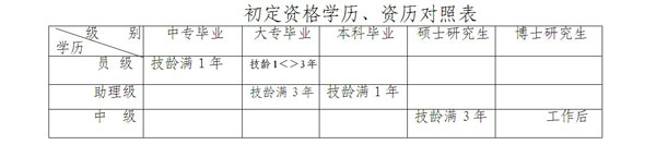1、初定條件:大中專畢業(yè)生在所學專業(yè)與所從事工作的專業(yè)相同或相近的前提下,具備以下國家規(guī)定的相應學歷、從事專業(yè)技術(shù)工作年限(表中簡稱“技齡”)的,可申請初定相應級別的專業(yè)技術(shù)資格: